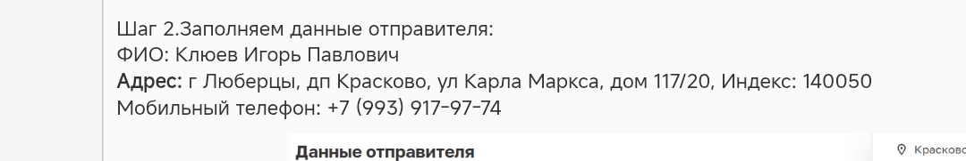 Город или адрес отправителя: обл Московская, г Люберцы, пгт. Красково, ул Карла Маркса, д. 117/20