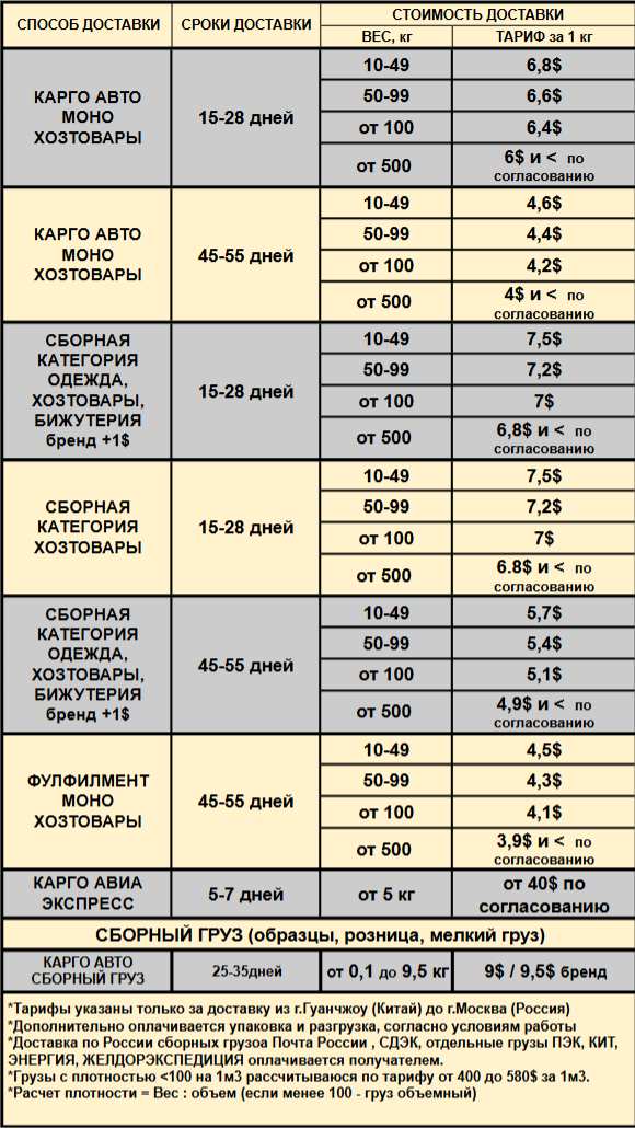 ~ Сумки, рюкзаки, ранцы, кошельки, визитницы, портмоне, косметички, органайзеры для хранения, текстильные корзины - рассчитывают по тарифу одежда. Товары народного потребления (ковры, ткани, мягкие игрушки, одеяла, постельное белье, пеленки, перчатки, губки и т.п, особенно бижутерия) рассчитываются + 0,5-0,7$ к любому тарифу, в том числе к тарифу Фулфилмент. Окончательную стоимость карго выставляет после оформления груза, в зависимости от категории товаров, веса и габаритов.